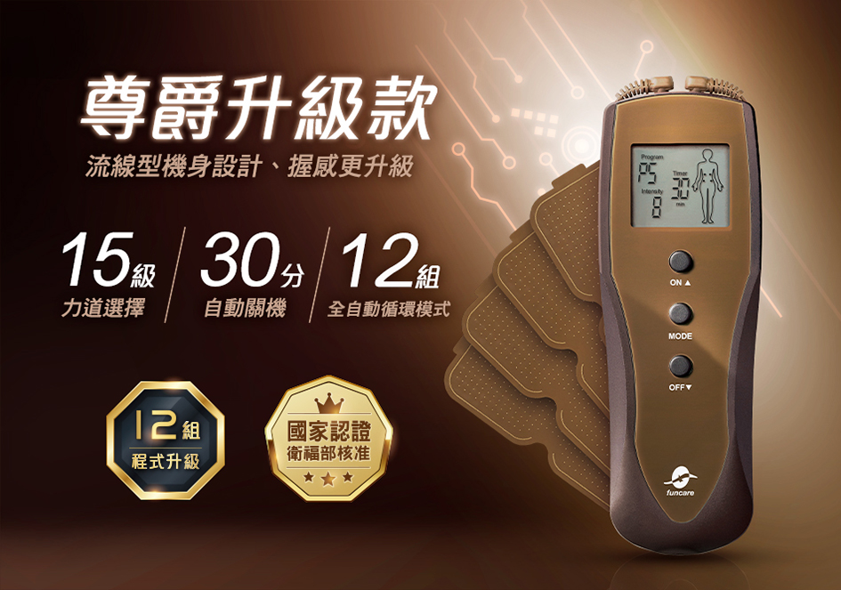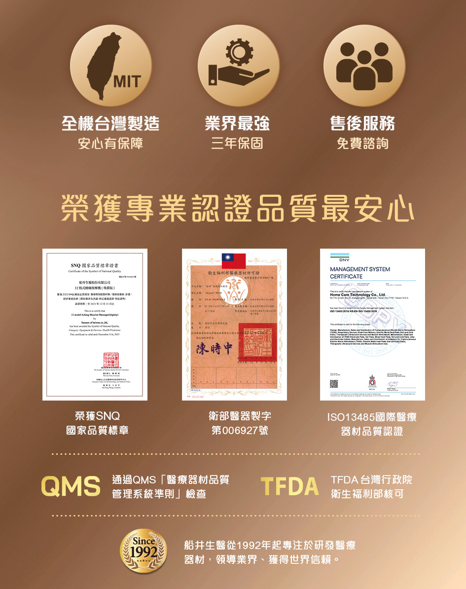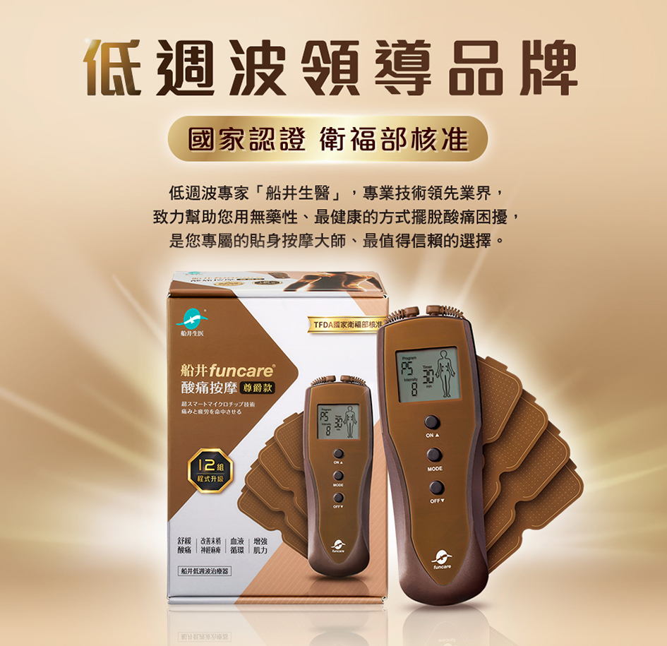 A:船井低週波-全新升級12程式酸痛按摩機,通過多項認證,敬請放心使用。