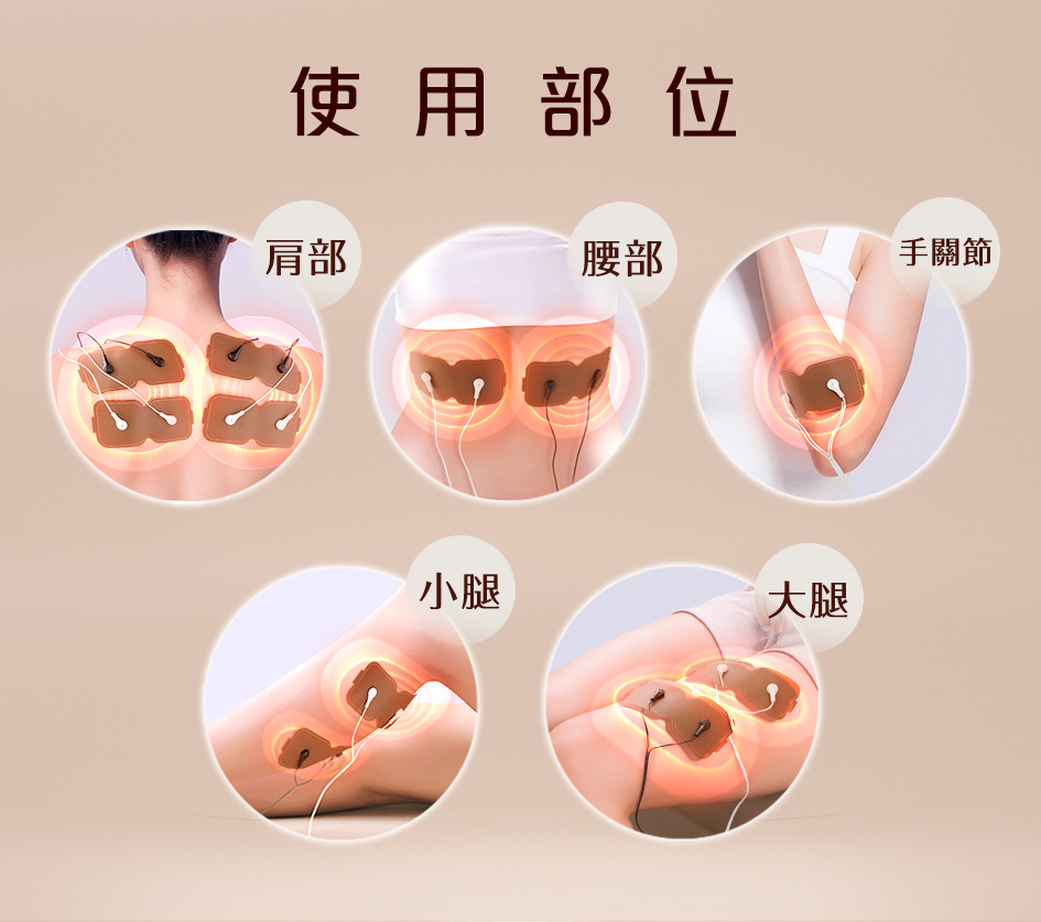 A:使用部位可在肩膀、腰、大腿、小腿、手關節等部位,不可將傳導片貼於心臟、頭、口、頸動脈、傷口、陰部及喉部或咽喉等敏感部位附近。