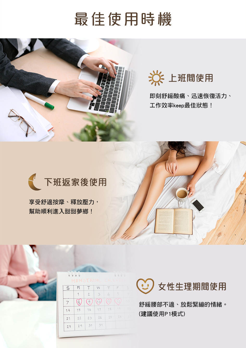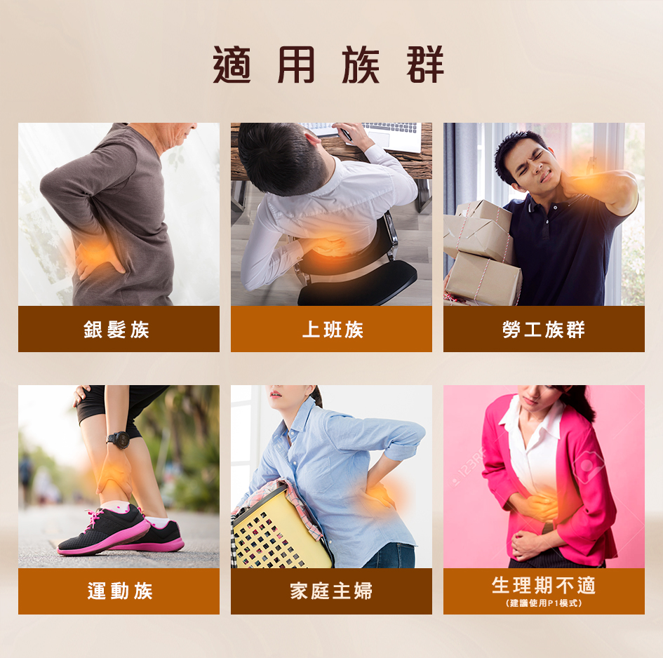 A:適合上班族、勞工族群、銀髮族、運動族和家庭主婦等,針對女性生理期不適,也可用於腰部放鬆緊繃。