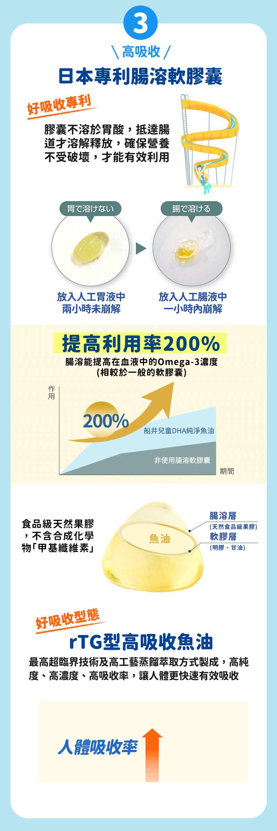 •日本原裝進口、藥廠等級製程,專利腸溶軟膠囊,提高營養利用率200%!