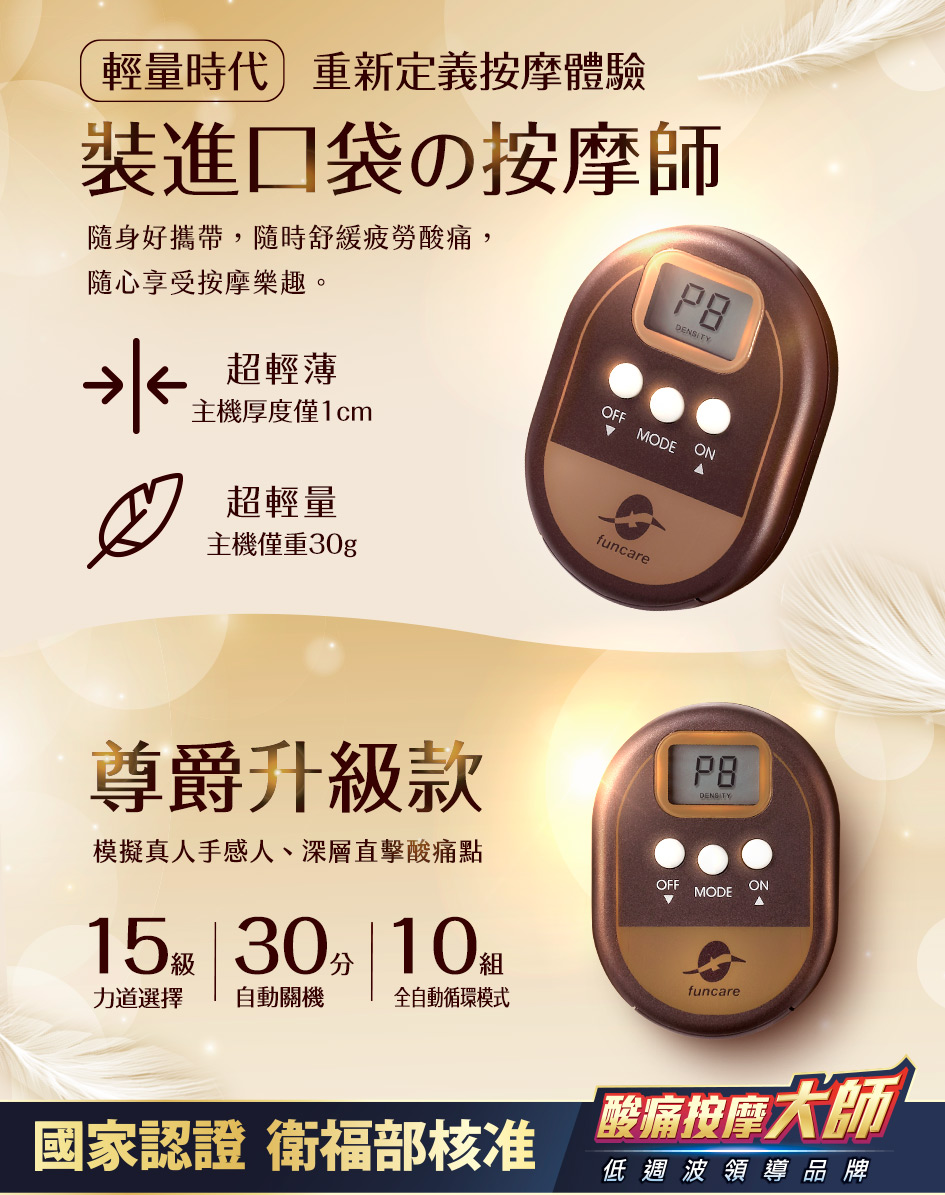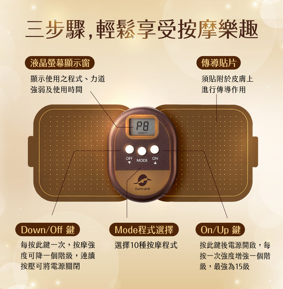 A:有15級力道可自由調整,透過低頻脈衝方式,使肌肉產生被動式運動,放鬆緊繃僵硬肌肉。