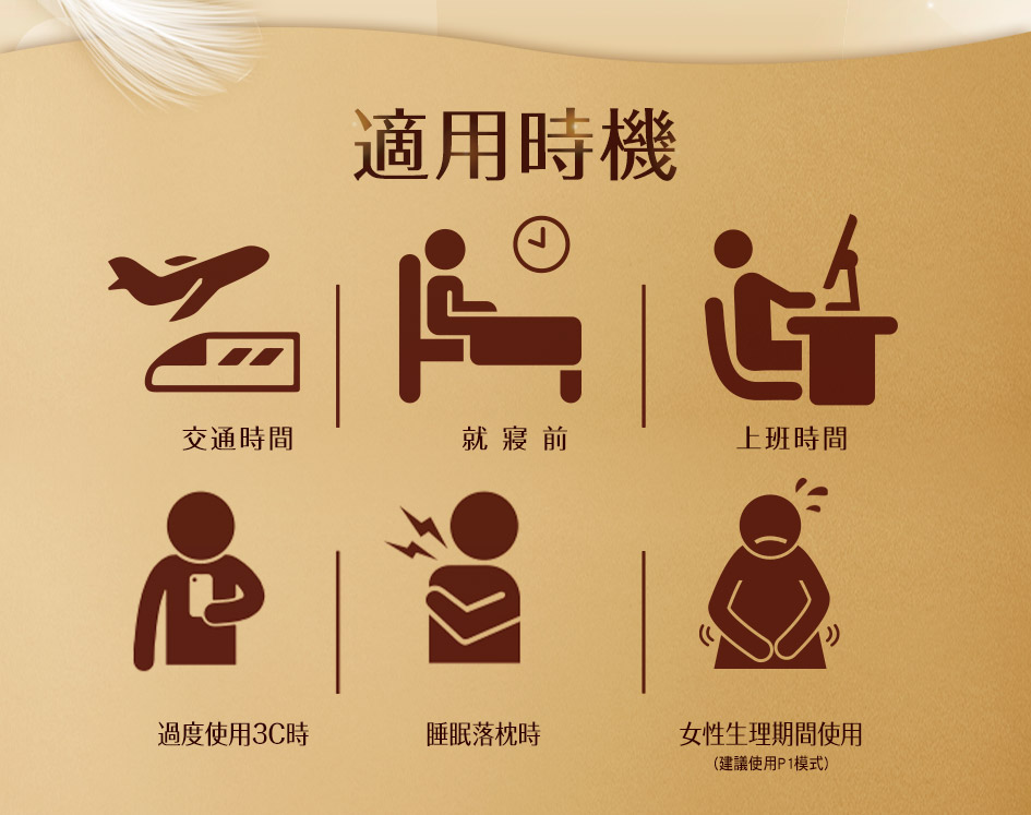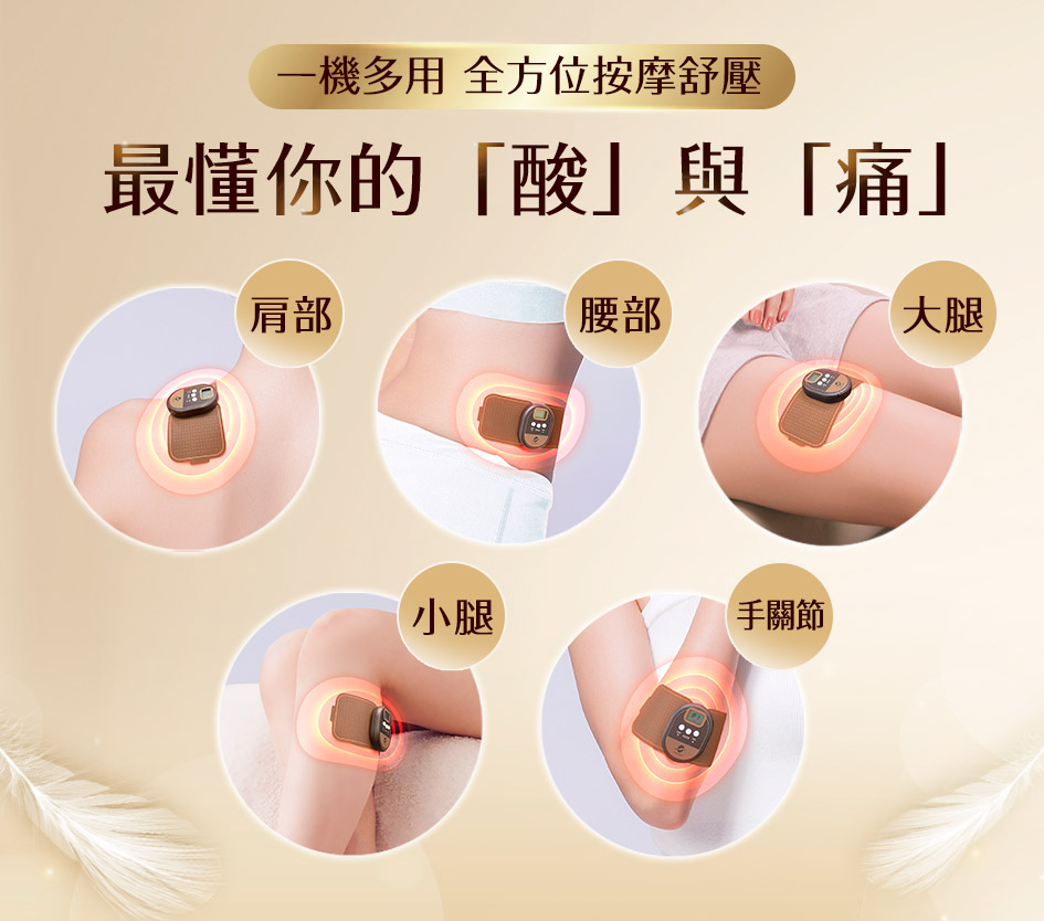 A:可做為全身多部位按摩使用,例:肩部、腰部、大腿、小腿、手關節(建議使用P1模式,舒緩生理痛)