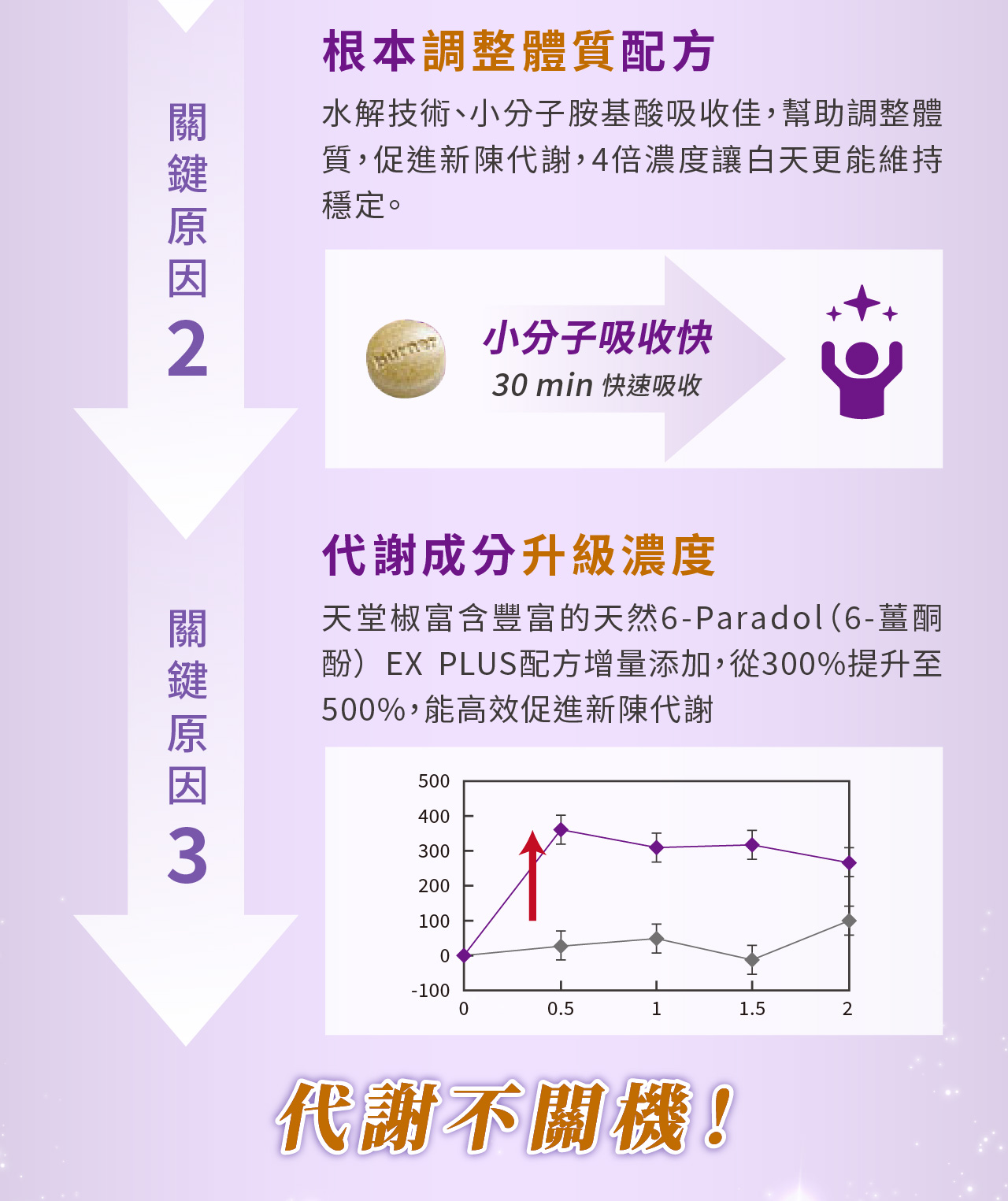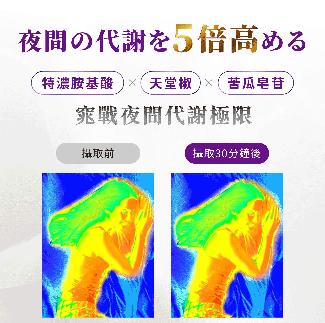 • 新陳代謝:「天堂椒、22種綜合胺基酸、苦瓜皂苷、碘」促進新陳代謝、調整體質