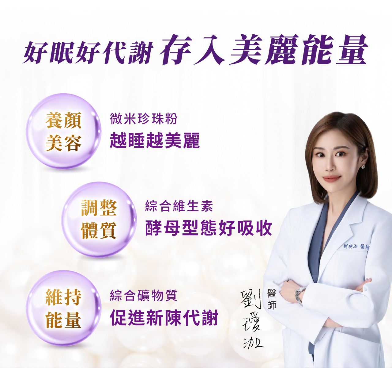 • 養顏美容:「微米珍珠粉、綜合維生素與礦物質」維持好氣色