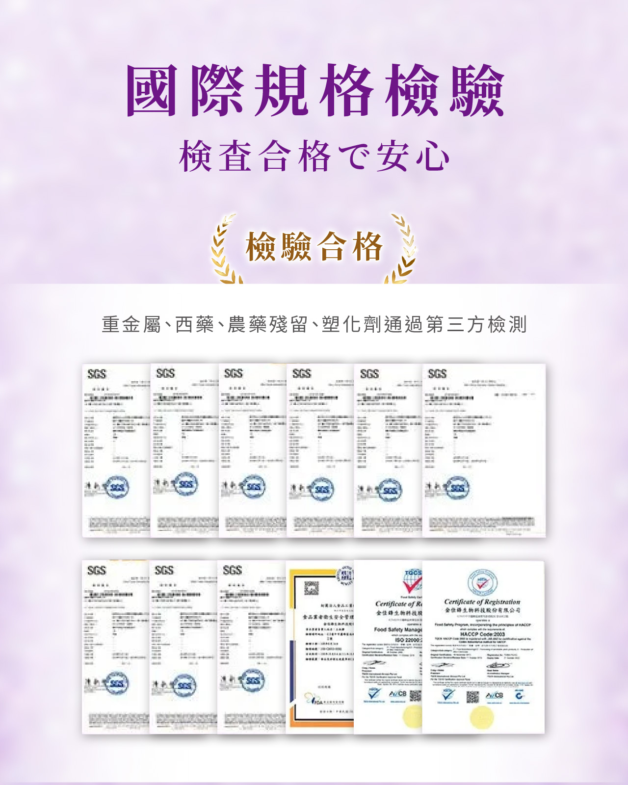 • 安全檢測:無西藥、無重金屬、無塑化劑,通過SGS 392項安全檢測合格