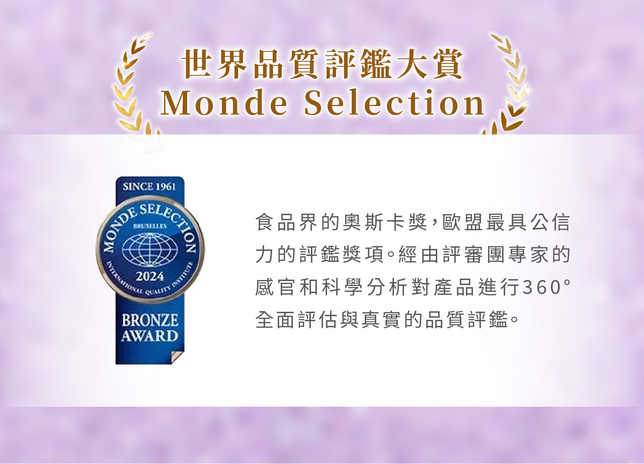 • 品質獎項:榮獲世界品質評鑑大賞