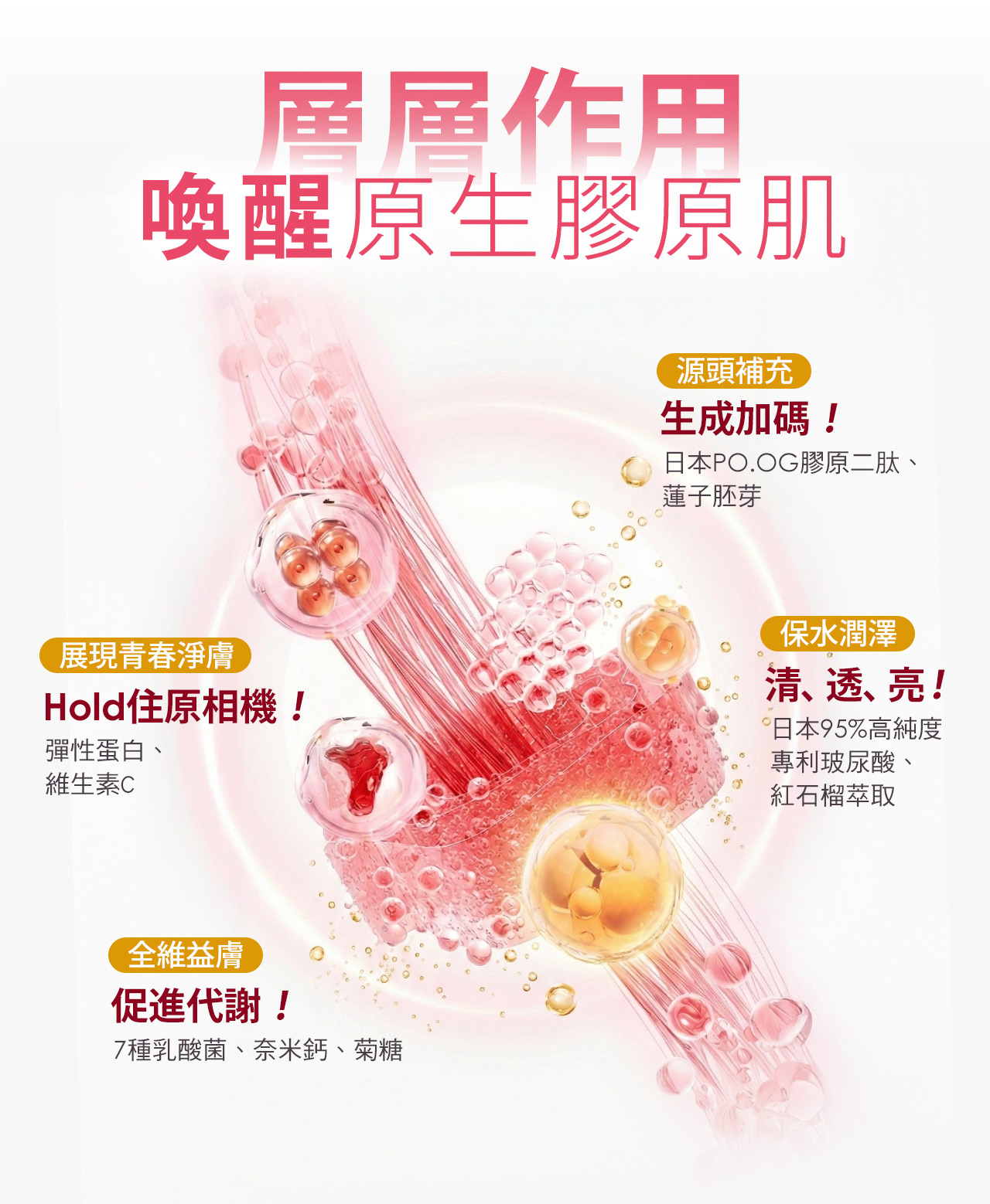 ★日本專利膠原二肽X專利紅石榴X日本專利彈性蛋白X日本大廠玻尿酸, 四大美妍成分,感受潤澤,重啟青春美麗