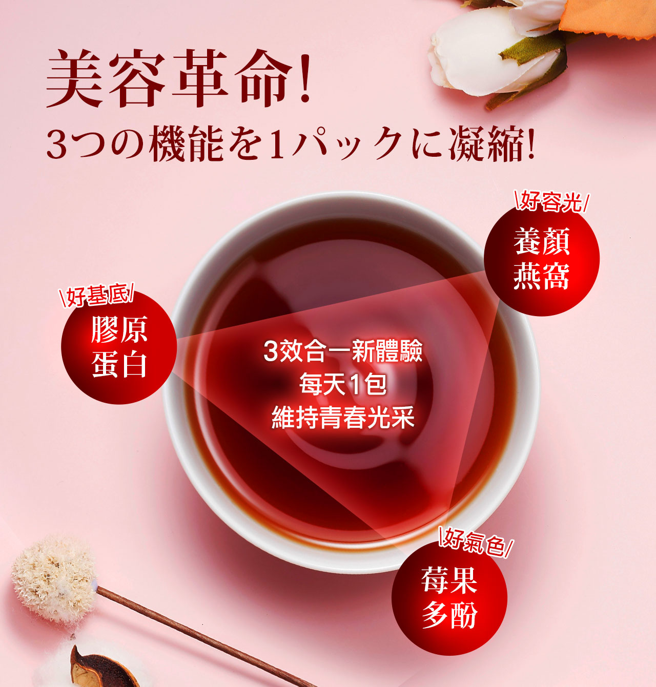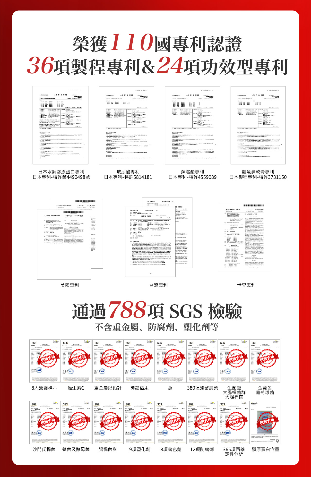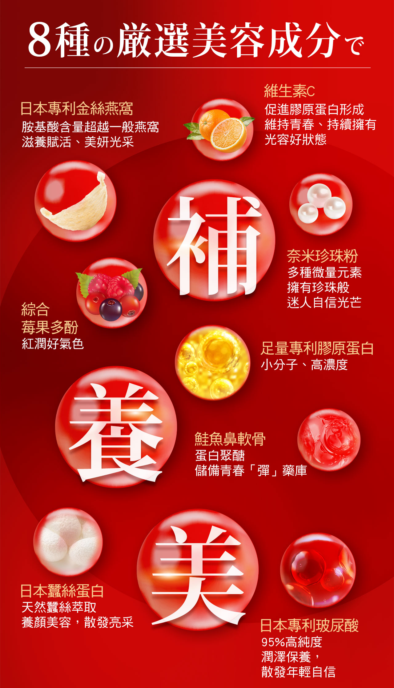 ● 日本研發監製,天天1包,健康美麗由內而生 ● 日本專利金絲燕窩➡外養顏,內滋補 ● 日本專利頂級玻尿酸➡潤澤保養,散發年輕自信 ● 日本專利鮭魚鼻軟骨➡儲備青春能量 ● 日本專利膠原蛋白➡奠定美姬基底 ● 奈米珍珠粉+莓果多酚+維生素C➡青春抗氧 氣色好 ● SGS國際安全檢驗788項合格 ● 110國專利認證