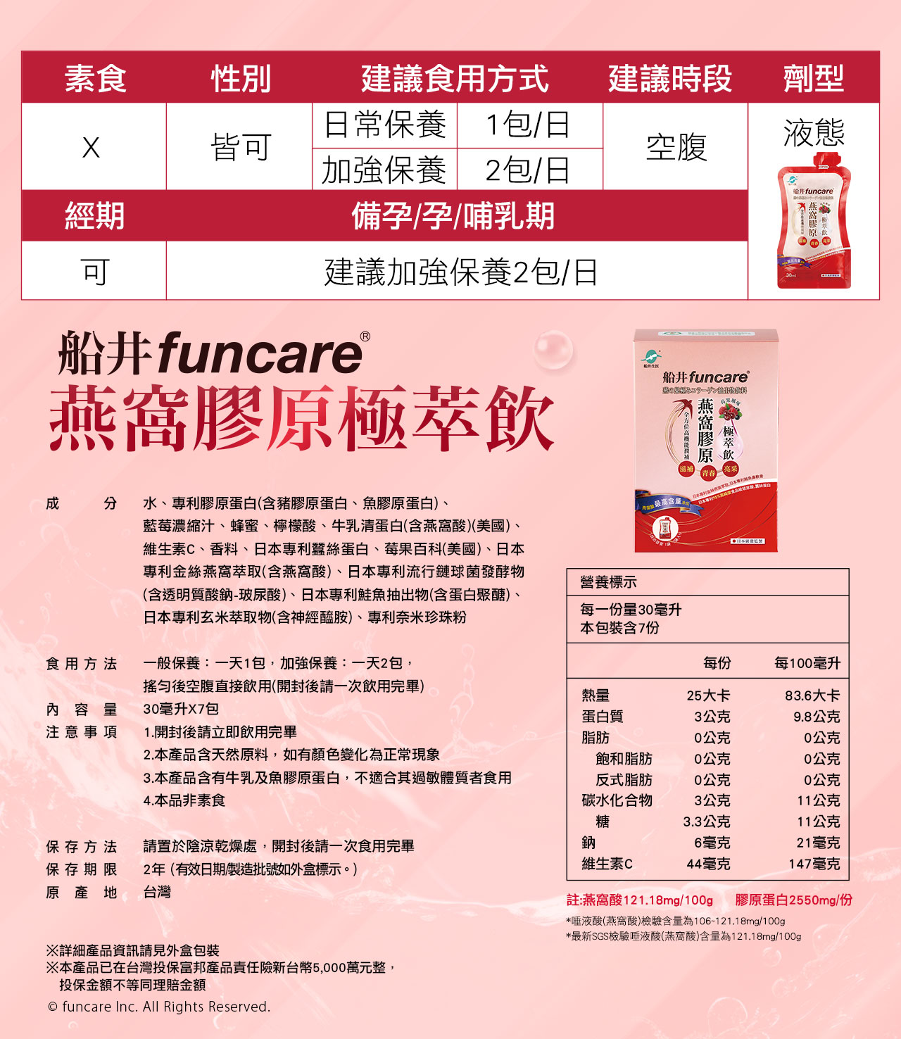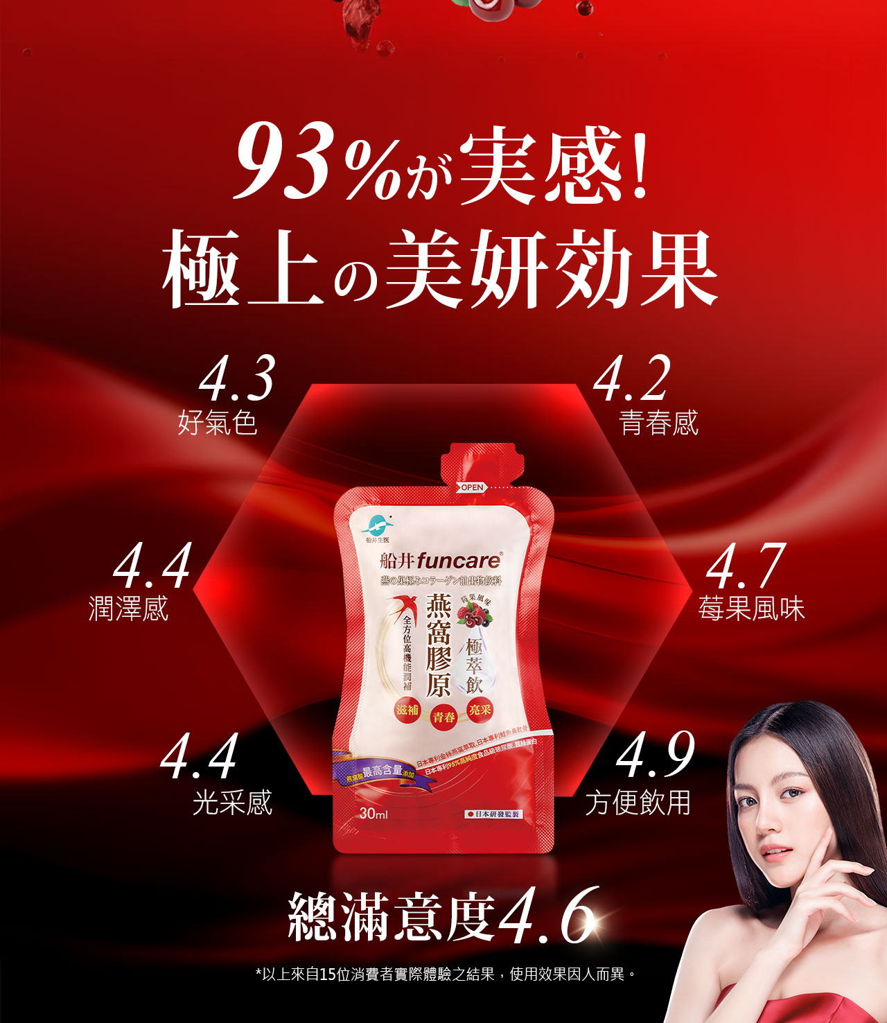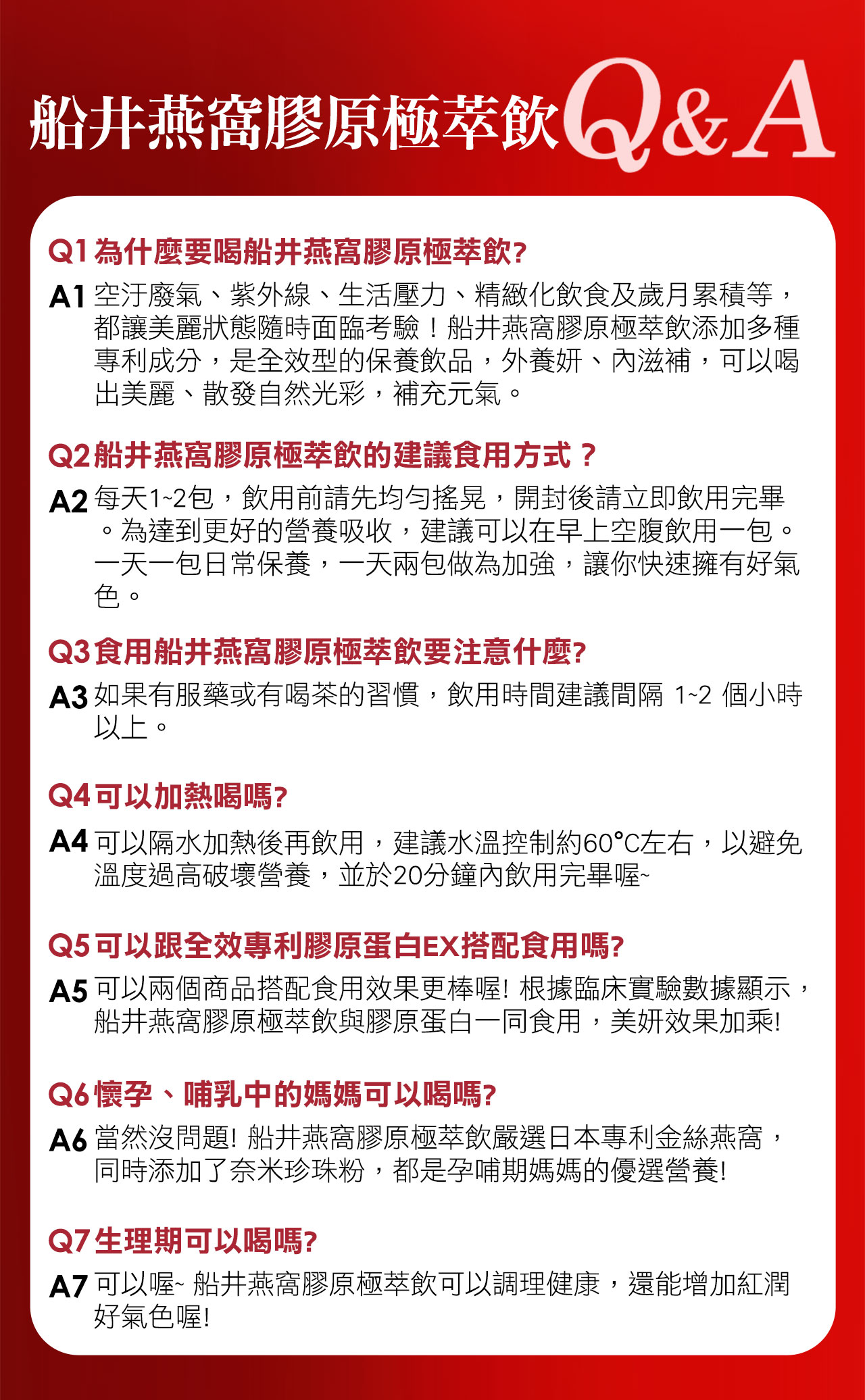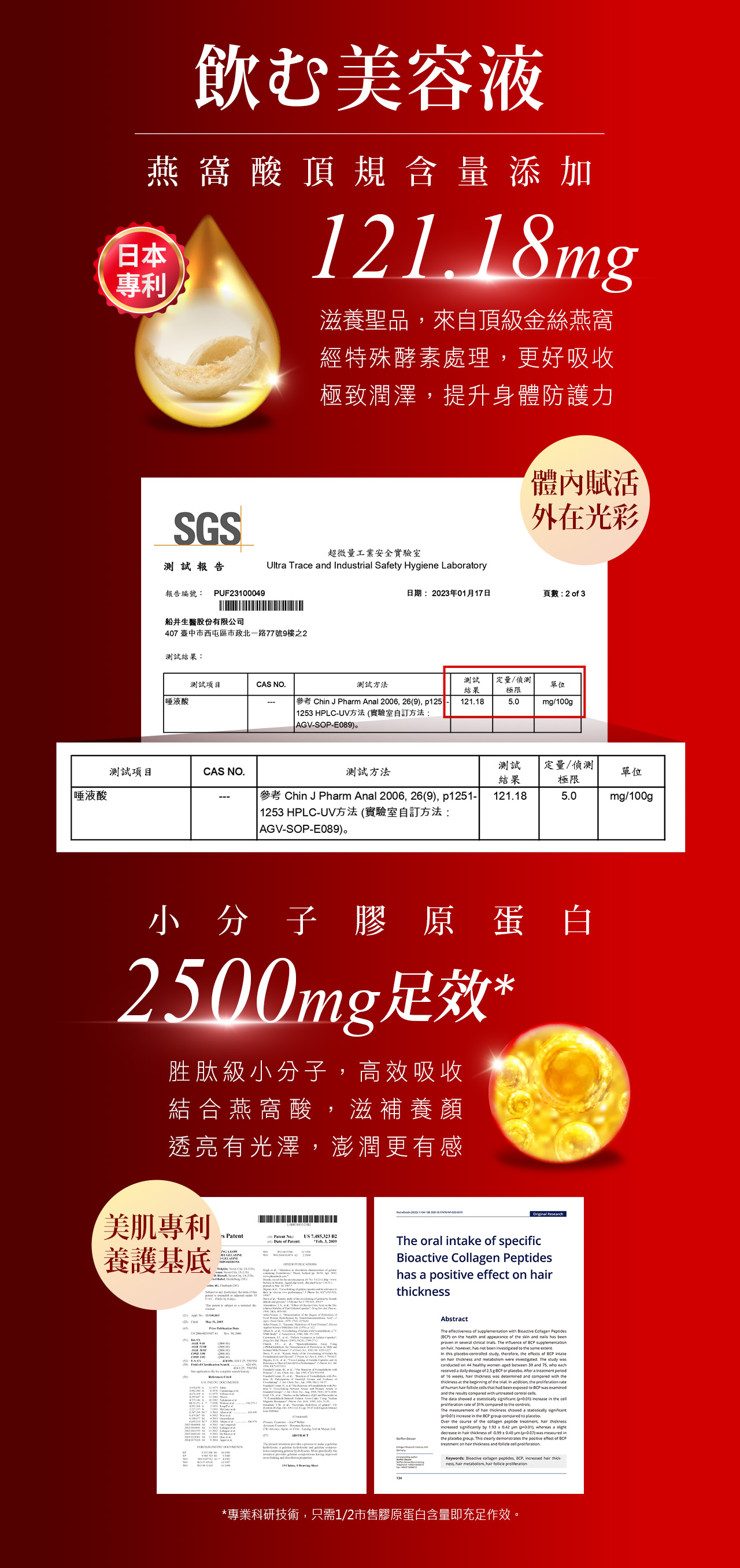 ● 日本研發監製,天天1包,健康美麗由內而生 ● 日本專利金絲燕窩➡外養顏,內滋補 ● 日本專利頂級玻尿酸➡潤澤保養,散發年輕自信 ● 日本專利鮭魚鼻軟骨➡儲備青春能量 ● 日本專利膠原蛋白➡奠定美姬基底 ● 奈米珍珠粉+莓果多酚+維生素C➡青春抗氧 氣色好 ● SGS國際安全檢驗788項合格 ● 110國專利認證