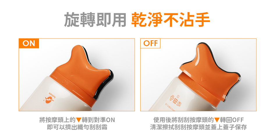 ◆按摩刮刮頭設計|人體工學高舒適,邊擦邊推,吸收快又不沾手