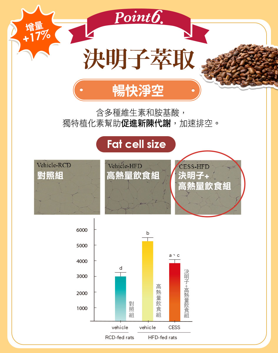 •決明子萃取 增量 17%:溫和促進腸道蠕動,輕鬆順暢輕盈。
