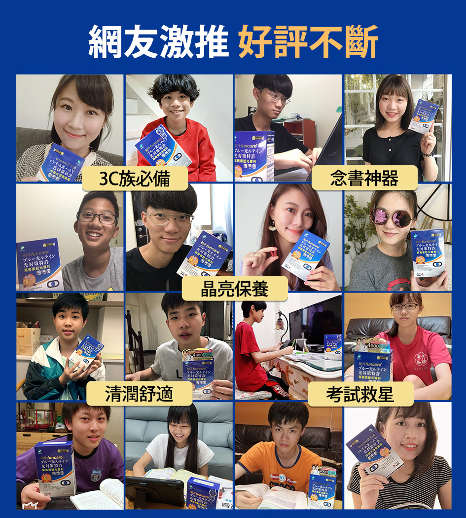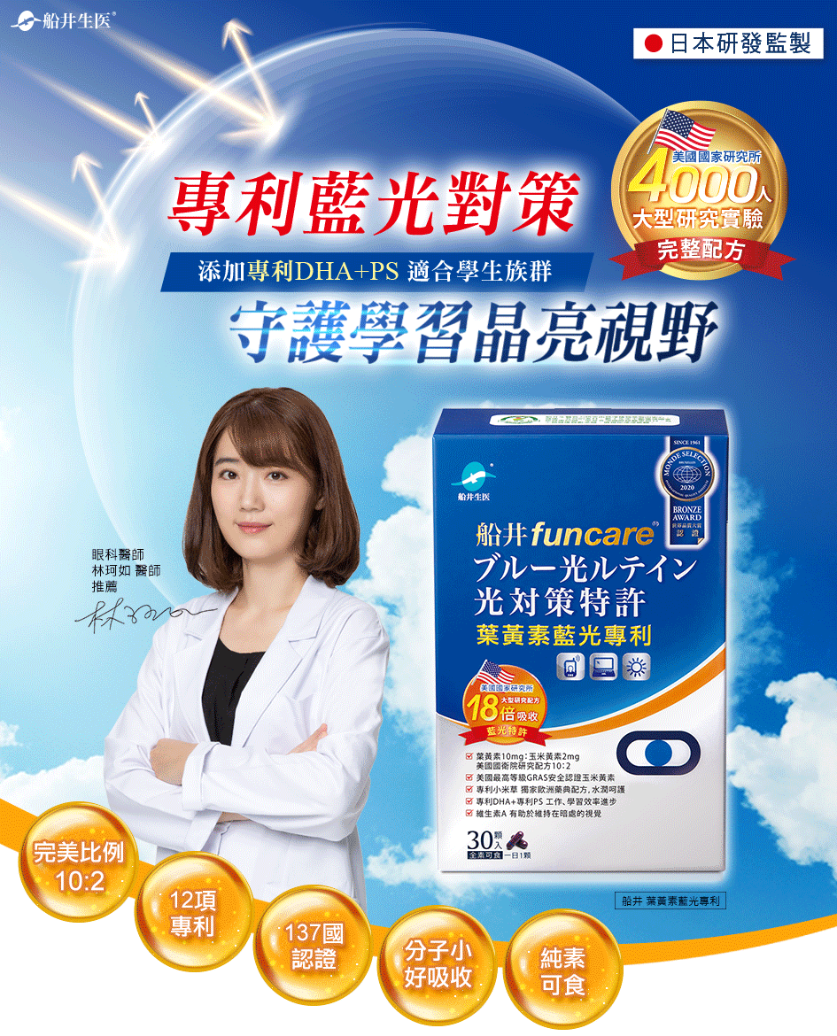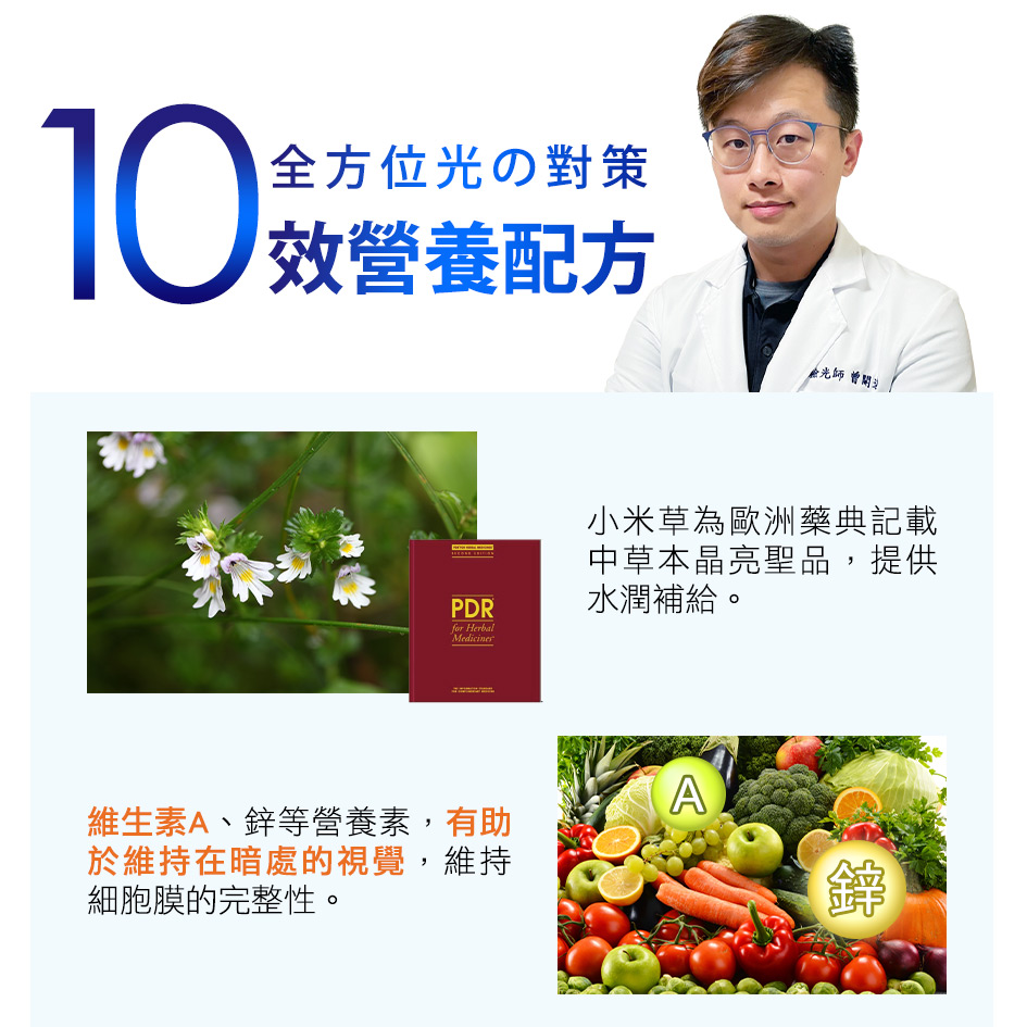 ◆遠距上課、頻繁接觸3C、藍光、電腦/筆電、平板,12歲以上孩童必備! ★葉黃素:玉米黃素 美國國衛院研究比例10mg:2mg ★美國最高等級GRAS安全認證玉米黃素 ★四大專利成分,十效營養配方 ★蝦紅素,調節保護 ★專利海藻DHA+小米草,健康呵護 ★專利PS,工作學習效率進步 ★維生素A,維持暗處視覺 ★榮獲世界品質評鑑大賞認證 ★全素可食 ★建議12歲以上補充